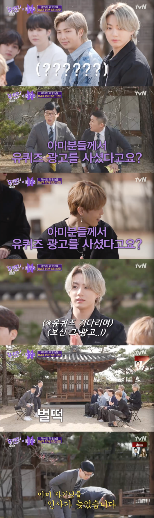 이에 제작진은 “아미들이 ‘유퀴즈’ 중간광고를 샀다”고 알렸다. 이 말에 유재석과 조세호는 자리에서 일어나 90도로 인사해 방탄소년단을 더욱 흐뭇하게 만들었다.