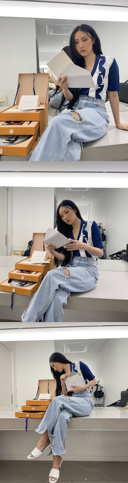 이번에 함께 공개된 사진에는 한 명품 브랜드로부터 받은 선물을 살펴보고 있는 화사의 모습이 담겨 있다.