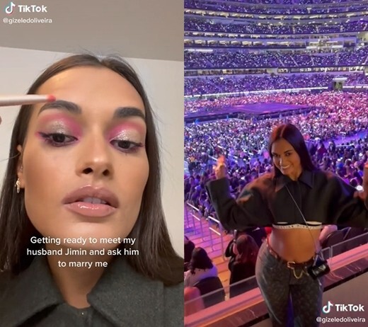 전 세계 최고 인기 보이그룹 방탄소년단의 2년 만의 오프라인 콘서트, LA 소파이 스타디움 공연에서 지민에게 결혼해달라고 소리질렀던 여성은 바로 93년생 유명 모델 지젤 올리베이라(Gizele Oliveira)였다.