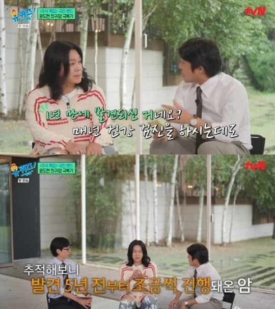 조세호가 “그럼 1년 만에 발견을 한 거냐”고 묻자 윤도현은 “저는 이미 5년 전부터 진행이 됐더라. 발견하기 힘든 거다. 발견하고 추적해보니 5년 전부터 발병이 됐던 거다”고 답했다. (사진=tvN ‘유 퀴즈 온 더 블럭’ 캡처)