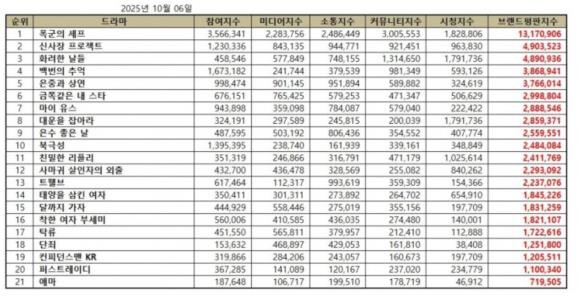 10월 드라마 브랜드평판 순위는 '폭군의 셰프', '신사장 프로젝트', '화려한 날들', '백번의 추억', '은중과 상연', '금쪽같은 내 스타', '마이 유스', '대운을 잡아라', '은수 좋은 날', '북극성', '친밀한 리플리', '사마귀: 살인자의 외출', '트웰브', '태양을 삼킨 여자', '달까지 가자', '착한 여자 부세미', '탁류', '단죄', '컨피던스맨 KR', '퍼스트레이디', '애마' 순이엇다.