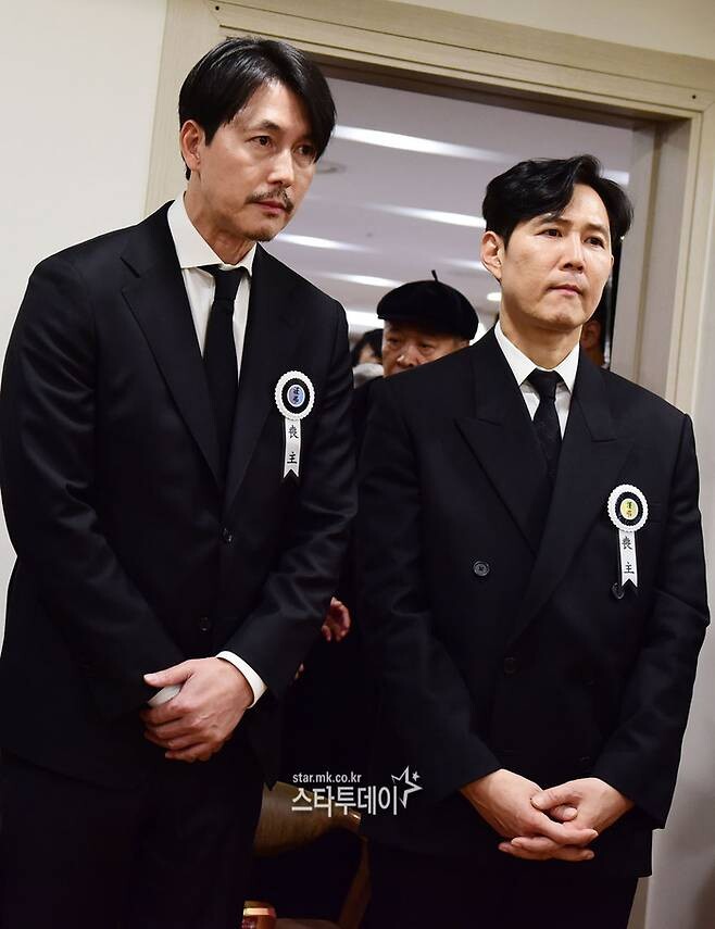 이날 정우성, 이정재는 빈소를 찾아 유족들과 함께 조문객을 맞이했다. 아버지의 금관문화훈장을 대신 받은 두 아들과 함께 문화체육관광부 최휘영 장관과 인사를 나눴다.