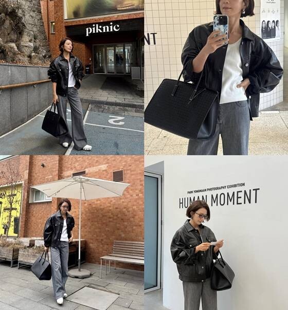 공개된 사진 속 김희애는 검은색 가죽 재킷에 청바지, 빅백으로 시크한 룩을 완성했다. 단발머리에 실버 이어링을 착용해 또렷한 이목구비를 강조하는 한편 뿔테 안경으로 '꾸안꾸' 매력을 선보였다.