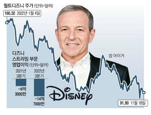 스트리밍 서비스 부문 1위에 오르고서도 약 2조원의 분기 손실을 보고해 충격을 안겼던 디즈니가 전 최고경영자(CEO) 겸 회장 로버트(밥) 아이거(71)를 구원투수로 내세웠다.