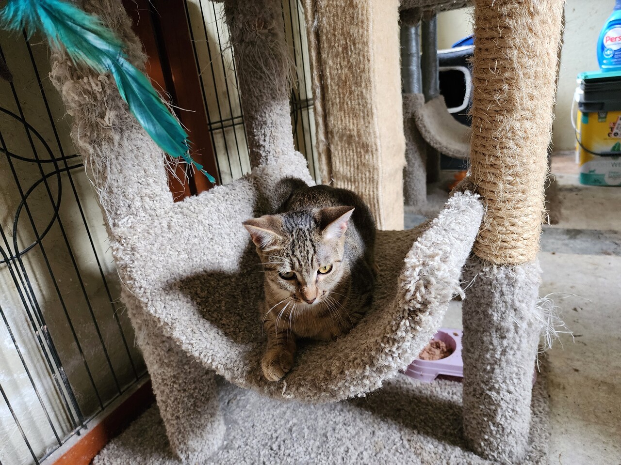 한달전 이웃집 뒷뜰에 어미없이 나타나 구조한 현재 약 5개월 나이로 추정되는 암컷 고양이 TAMMY를 입양 보내려고 합니다