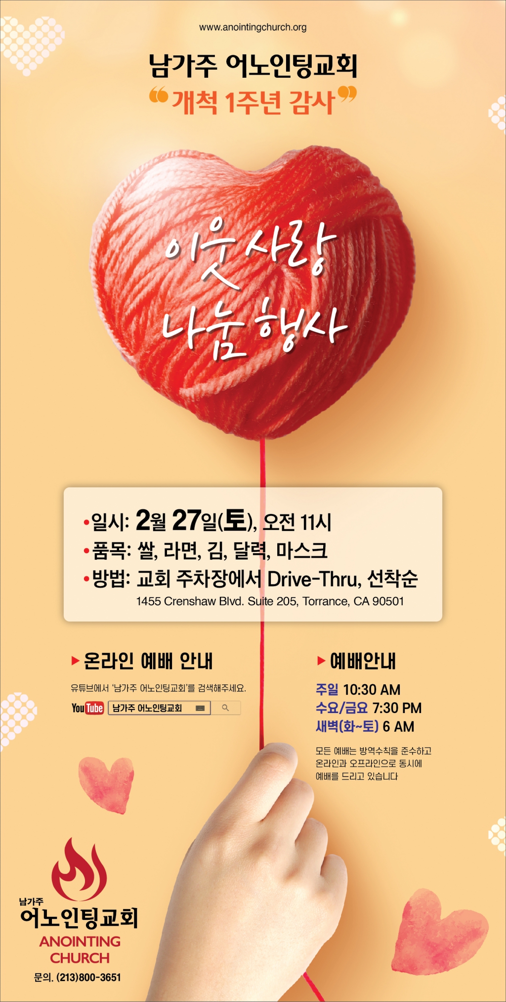 남가주 어노인팅교회는 개척 1주년을 맞이하여 이웃사랑 나눔행사를 실시합니다. 남가주 어노인팅교회는 하나님의 인도하심에 따라 작년 2월 16일에 토렌스에 교회를 개척하고 Covid-19시대에 아파하고 힘들어하는 이웃들에게 복음으로 위로 하였습니다. 아울러 선교와 전도, 구제와 봉사, 장학사업을 통하여 하나님의 사랑을 실천하고 있습니다.