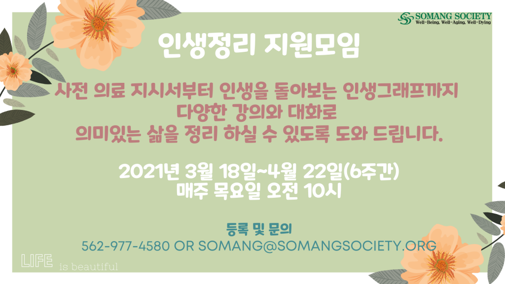 아름다운 삶, 아름다운 마무리의 비젼으로 한인사회에서 활동 중인 소망 소사이어티(이사장 유분자) 에서는 아름다운 삶의 마무리를 준비할 수 있게 돕는 모임을 준비하고 있다. '아름다운 마무리를 위한 모임(아마모)'로 명명되어진 이 모임은 3월 18일(목) 오전 10시 30분부터 시작되며 6주간 매주 목요일 같은 시간에 열리게 된다.
