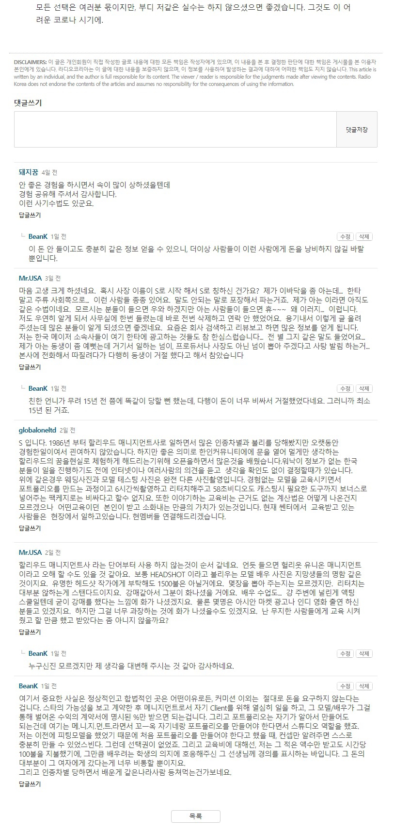 LA에 있는 광고모델/배우 Management에 관한 글입니다. 그 대표를 S라고 지칭하겠습니다.
