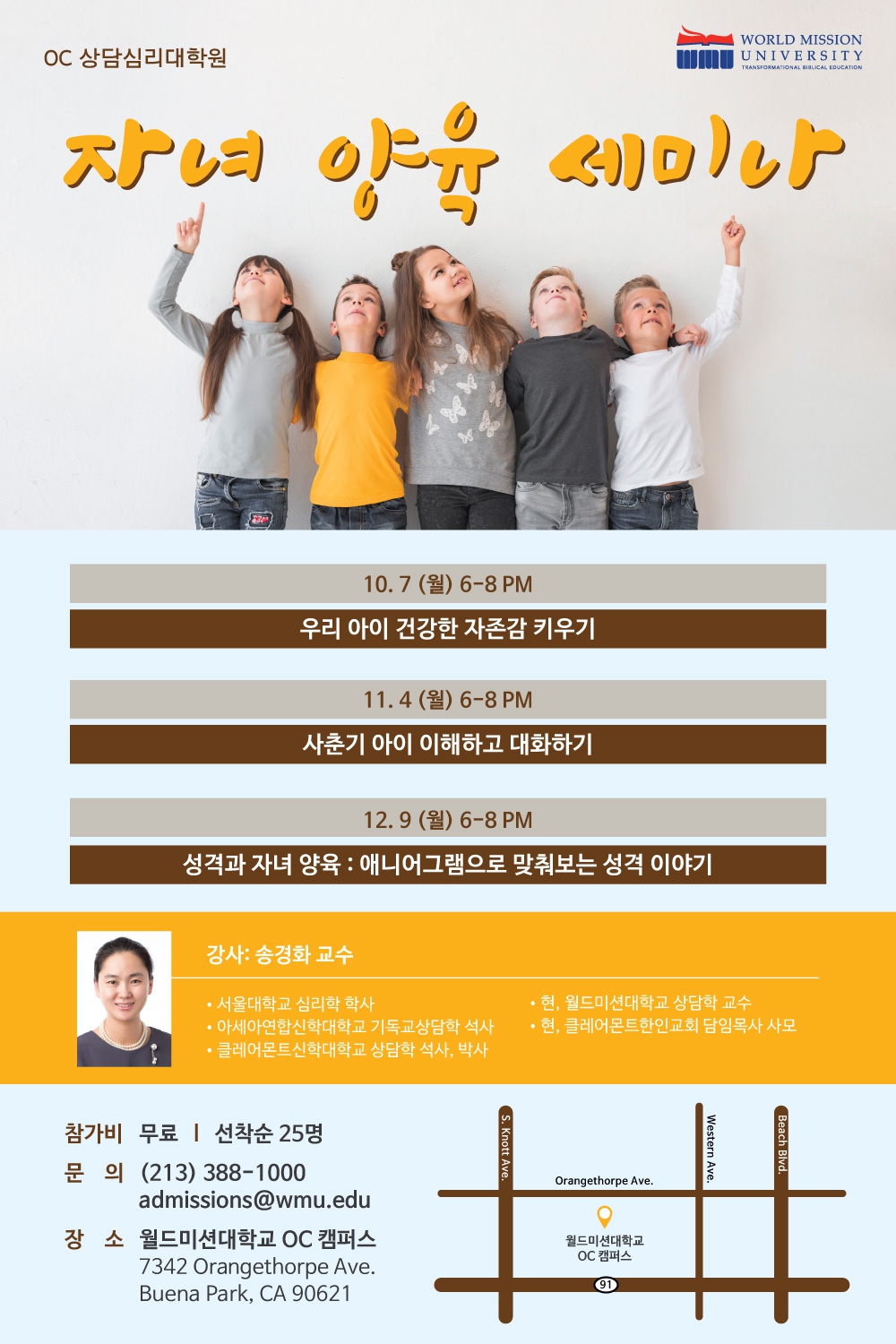 Orange County에 위치한 World Mission University 상담심리대학원에서 열리는 두가지 세미나에 여러분들을 초대합니다.