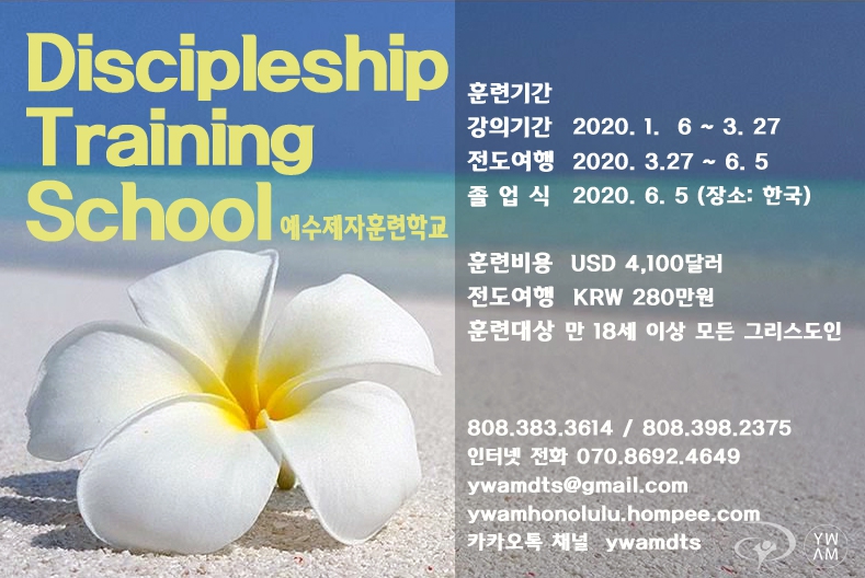 * 하와이에서 DTS를 하고자 하는 마음이 있으나 재정 때문에 염려하시는 분이 있으시다면 재정보다는 하나님의 인도하심을 따르시기를 권면합니다. 우리는 이 학교가 재정이 있어서 오고 재정이 없어서 못 오는 것이 아니라, 하나님 말씀에 순종하는 분이 오기를 기도하고 있고 있습니다. 믿음으로 행하는 것이 무책임해 진다는 말은 아니지만 재정을 통해 다루시고 공급하시는 하나님을 신뢰하고 믿음으로 행하시기를 바랍니다.