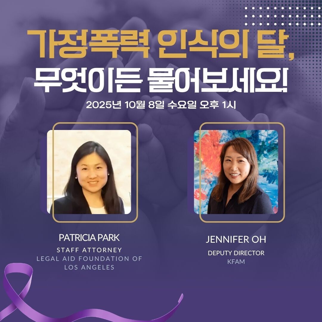 가정폭력 인식의 달을 맞아, 그동안 궁금하셨던 질문들에 대해 함께 이야기 나누는 시간을 마련했습니다. 이번 라이브에서는 Legal Aid Foundation of Los Angeles의 변호사님과 함께 방송을 진행합니다.