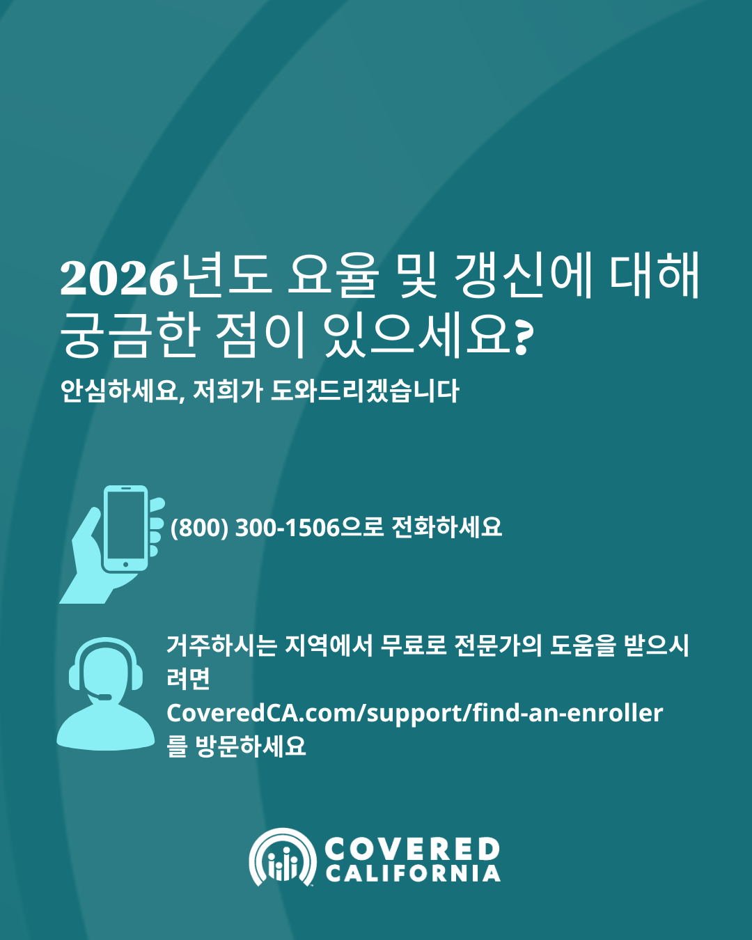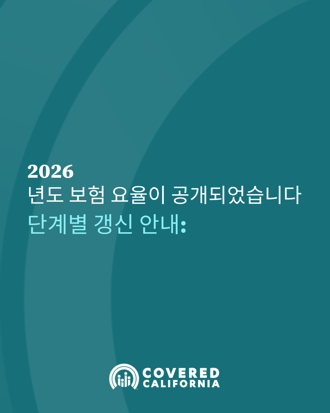 달력에 표시해 두세요! @CoveredCA 갱신 시즌이 10월 15일에 시작되었습니다. 현재 Covered California를 통해 건강보험 플랜에 가입되어 있으시다면, 지금이 다양한 옵션을 검토하고 여러분과 가족에게 가장 잘 맞는 건강보장을 확인할 시기입니다.