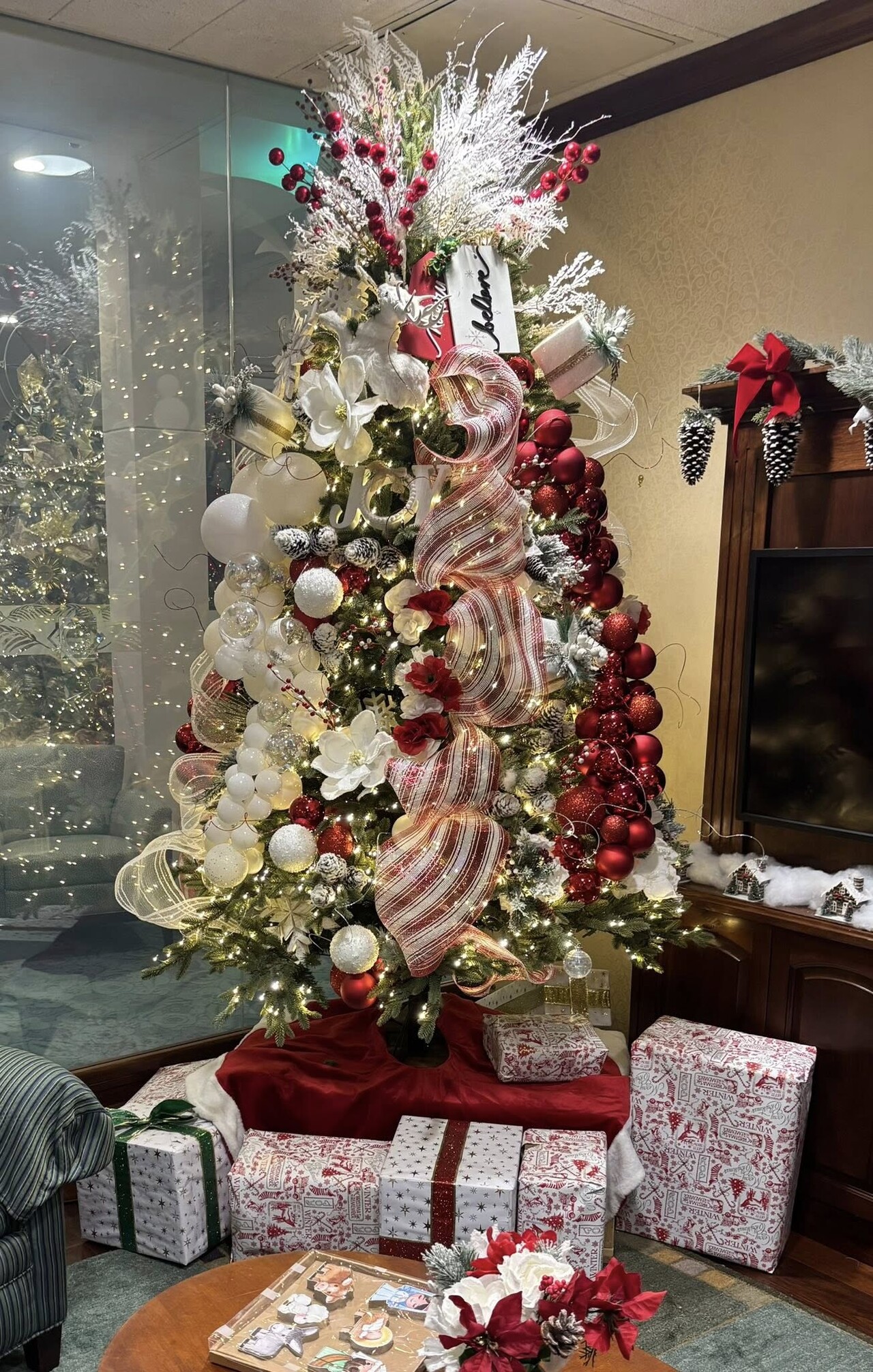 반짝이는 크리스마스 트리와 빛나는 장식들 속에서