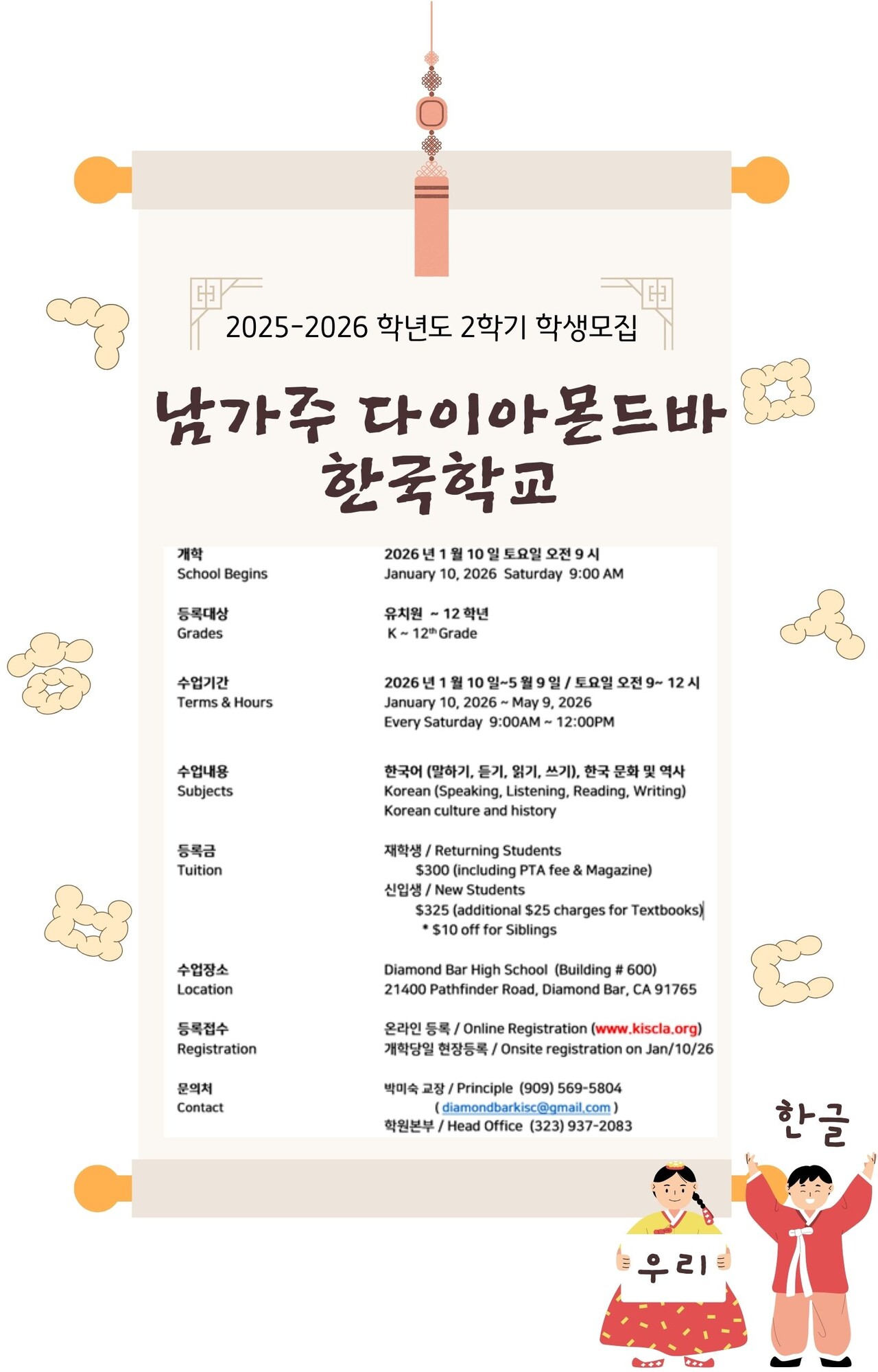 남가주한국학원의 11개 지역 학교 중 하나인 다이아몬드바 한국학교에서 2025-2026 학년도 2학기 학생을 모집하고 있습니다.