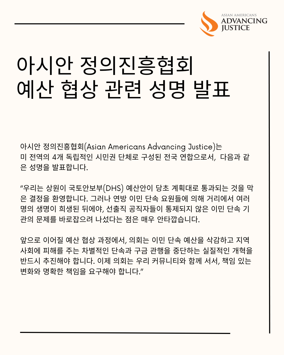 의회는 이민 단속 예산을 삭감하고, 지역사회에 해를 끼치고 차별적인 단속과 구금 관행을 중단하는 실질적인 개혁을 즉각 시행해야 합니다. 지금이야말로 의회가 우리 커뮤니티와 함께 서서 책임과 변화를 요구해야 할 때입니다.
