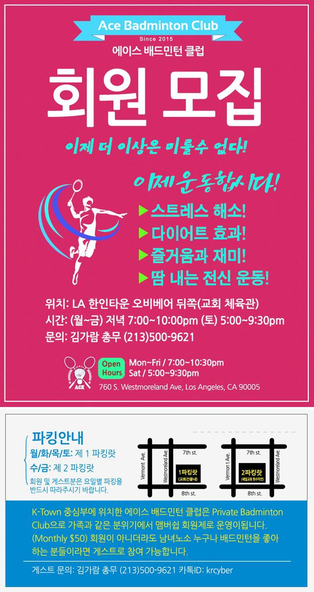 에이스 배드민턴 클럽에서는 즐겁게 땀을 흘리며 운동할 회원을 모집합니다.