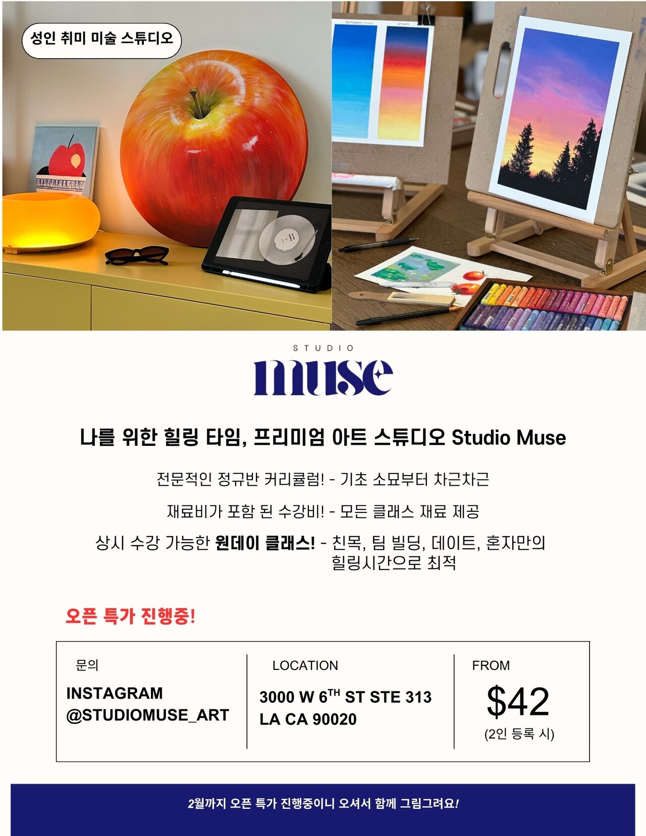 LA 코리아타운 6가에 새롭게 오픈한 아트 스튜디오로 성인들을 위한 취미미술 공간입니다.