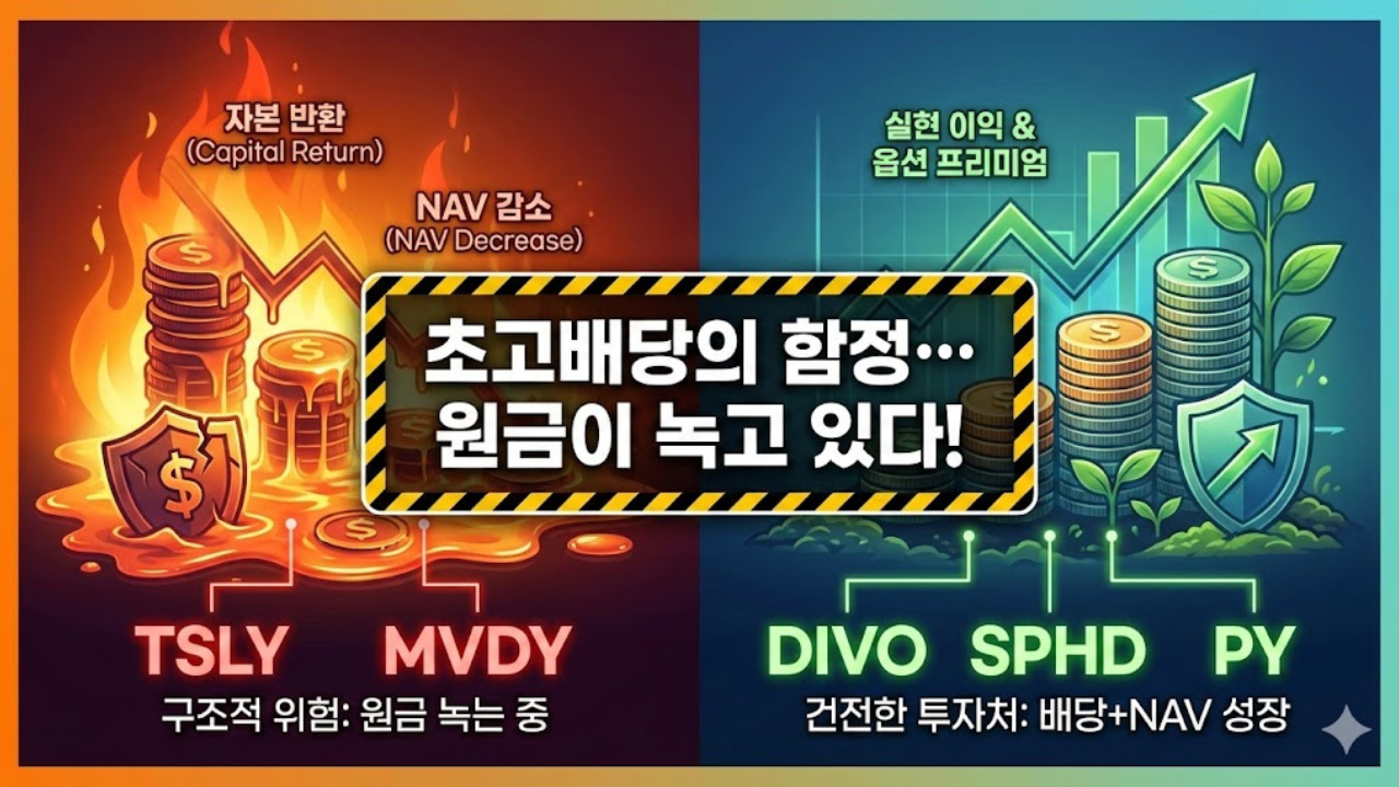 초고배당 ETF, 배당은 많지만 실제 수익은 전혀 다를 수 있습니다. TSLY·MVDY처럼 자본 반환에 의존하는 ETF는 배당을 받을수록 원금이 줄어드는 ‘NAV 침식’ 위험이 커집니다. 커버드콜 구조의 한계와 총수익률 저하 문제를 간단히 정리했습니다.