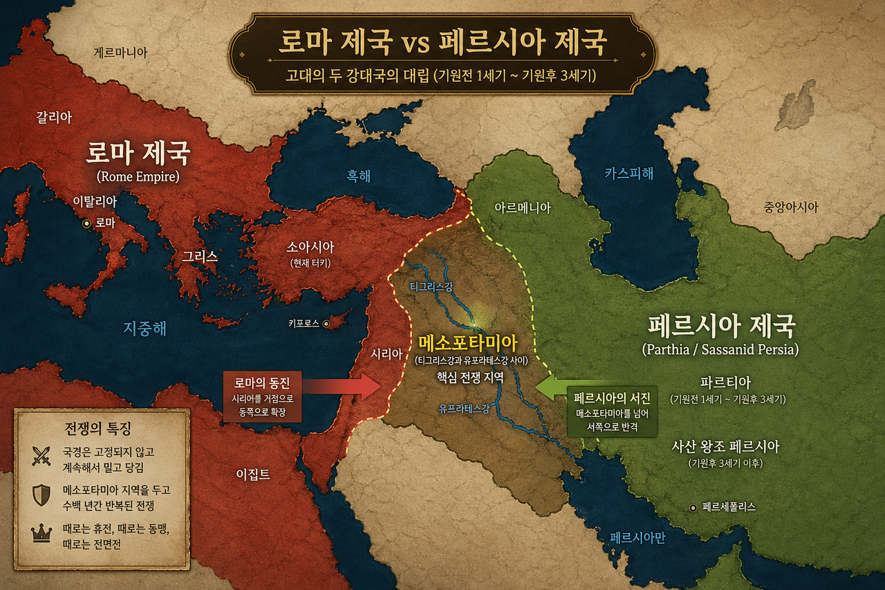 기원전 54년 카르헤 전투를 시작으로 기원후 628년 헤라클리우스 황제의 최후 전투까지 약 680년의 세월동안 수백 차례에 걸쳐 크고 작은 전쟁을 치루며 대립했는데 대부분의 역사 학자들은 원정을 통한 대규모의 전면전만 20회 정도로 분류하고 있다.