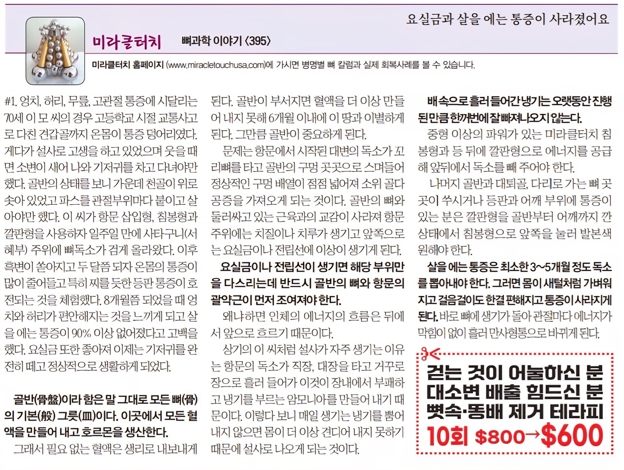 주소:3544 W Olympic bvd #212 LA CA 90019 미라클터치 뼈과학 연구소