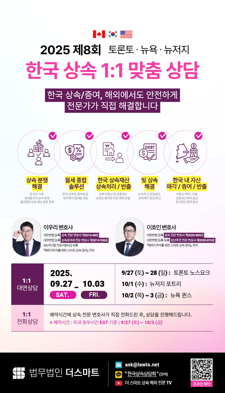 모두 사전 예약제로만 운영되며, 현재 남은 자리가 많지 않습니다. 이번 기회를 통해 미뤄두었던 한국 상속 문제를 꼭 점검해 보시길 바랍니다.