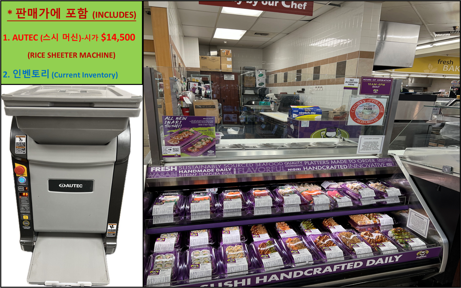 판매가: $18,000 (Autec-스시머신 & 인벤토리 포함)