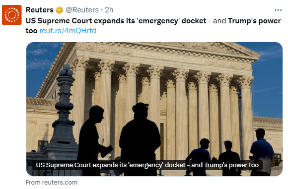 연방대법원이 긴급 사건 처리 절차인 이른바 섀도우 더킷(Shadow Docket)을 점점 더 폭넓게 사용해, 이 관행이 도널드 트럼프 대통령의 행정 권한을 강화하는 주요 통로가 되고 있다는 분석이 나오고 있다. 로이터 통신은 연방대법원이 정식 구두 변론과 충분한 검토 없이 비…