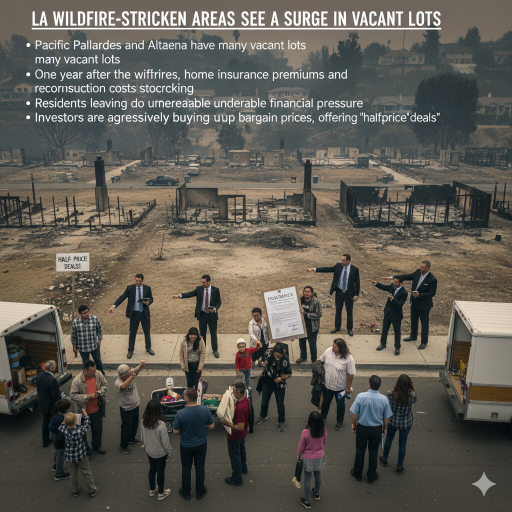 최근 남가주 LA 대형 산불 피해 지역들인 알타디나(Altadena)와 퍼시픽 팰리세이즈(Pacific Palisades) 등에서 매물로 나온 빈터(Vacant lot)가 급증하고 있다. 주민들이 주택 재건 비용과 보험료 등으로 금융 압박을 받고 있는 상황이 되자 투자자들이 이 틈을 타 공격적인 매수에 …
