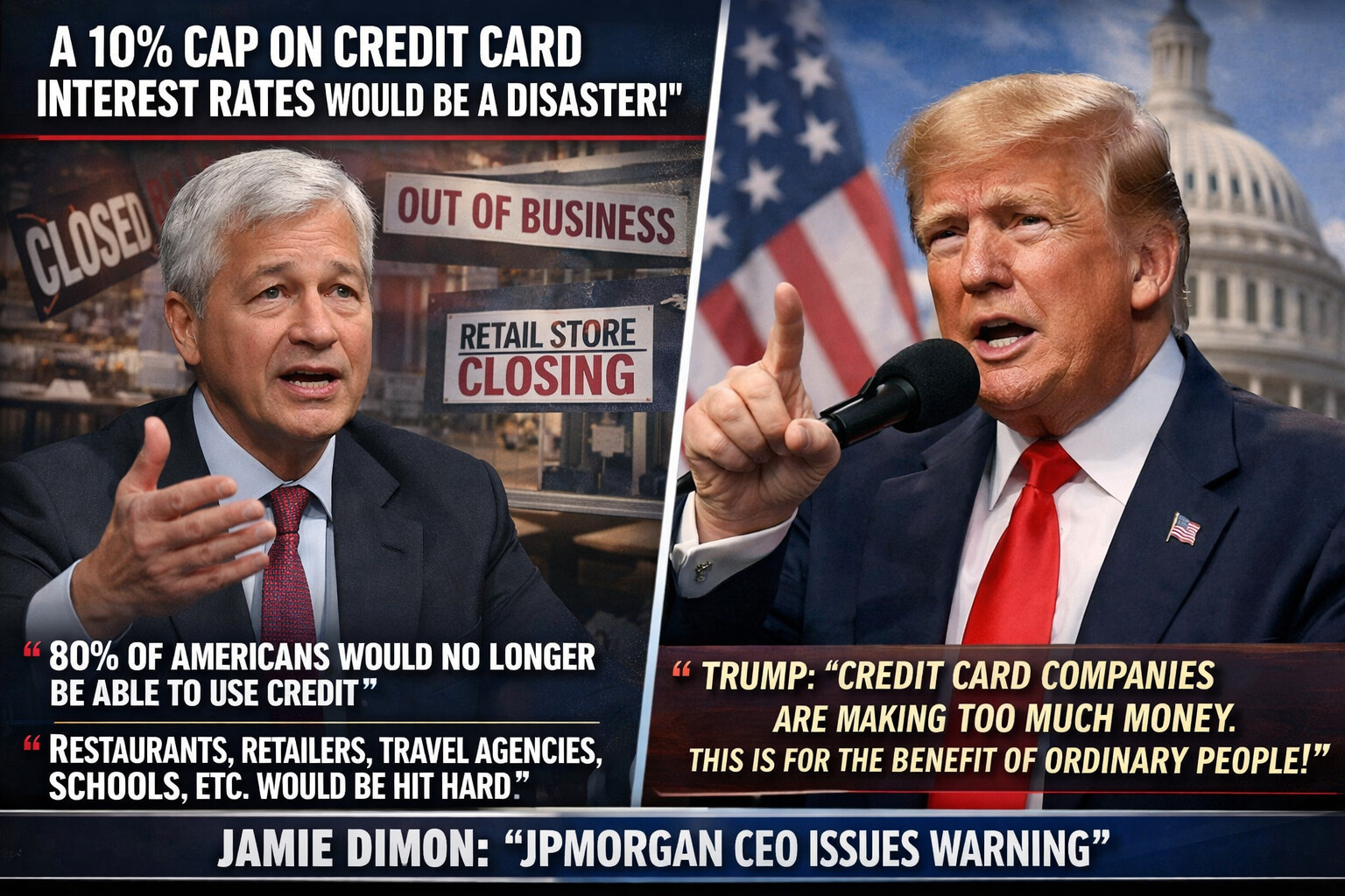 우리들의 실생활과 가장 밀접한 '신용카드 이자율'이 최근에 뜨거운 감자가 되고 있는 상황이다. 도널드 트럼프 대통령이 제안한 '이자율 10% 상한제'를 두고 세계 최대 은행인 JP모건의 제이미 다이먼 회장이 강력한 경고를 날렸다. 트럼프 대통령은 카드사들이 돈을 너무 많이 번다며 서민들에게 너무나 큰 재정적인 부담이 된다면서 신용카드 이자율 10% 상한선 도입을 강력히 시사했는데 제이미 다이먼 회장은 10% 상한선 도입 시 미국인들 약 80% 정도가 아예 신용거래를 못하게 되는 상황이 될 것이라고 예측하고 그러면 레스토랑과 소매점, 여행사 등이 타격을 받을 것이라고 경고했다. 미국 최대 은행인 JP모건 체이스를 이끌고 있는 제이미 다이먼(Jamie Dimon) 회장이