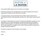 LA통합교육구 전 교육감 오스틴 뷰트너 LA시장 선거 하차 오스틴 뷰트너 전 LA통합교육구 교육감이 LA시장 선거 하차를 공식 발표했다. 지난달(1월) 딸인 올해 22살 에밀리 뷰트너가 사망한 슬픔이 가장 큰 이유로 보인다. 오스틴 뷰트너 전 교육감은 지지자들에게 보낸 이메일을 통해 사랑하는 딸 에밀리 뷰트너를 잃은 상상할 수 없는 비극을 겪었다고 밝혔다. 에밀리는 삶의 빛이었다고 밝힌 뷰트너 전 교육감은 성공적인 선거운동과 시장직에는 24시간 내내 헌신할 수 있는 사람이 적합하다고 전했다. 하지만 가족이 언제나 최우선이었고 현재도 그렇다며 지금은 가족 곁에 있어야 할 때라고 덧붙였다. 뷰트너 전