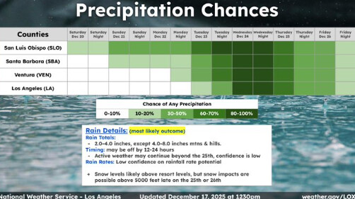 강력한 ‘파인애플 익스프레스’ 폭풍이 크리스마스 전후로 캘리포니아를 강타할 가능성이 커지면서, 남가주에 폭우와 산간 폭설이 예보됐다. 국립기상청에 따르면, 이 대기의 강(atmospheric river)은 크리스마스 기간 남가주에 최근 수년 사이 가장 강력한 비를 몰고 올 가…