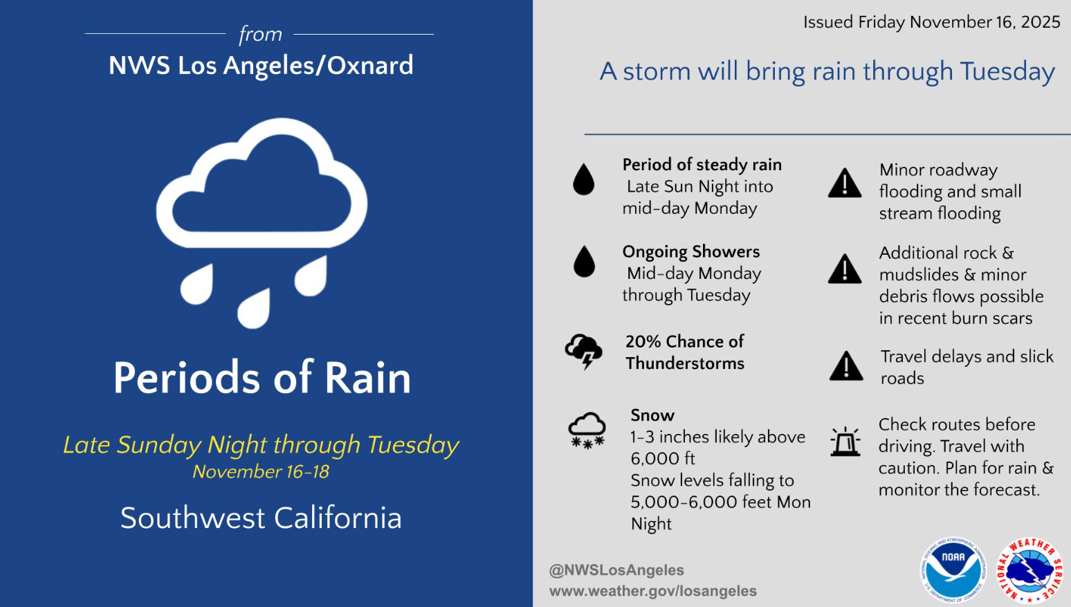 산악 지역에서는 10~20% 확률로 천둥 번개가 예상되며, 산타이네즈와 벤추라 서부 산악지대에는 국지성 호우가 가능하다.