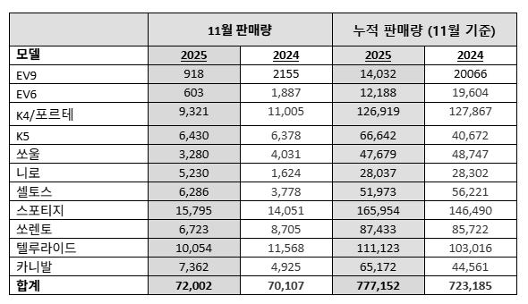 특히 카니발 MPV(+49%)가 역대 최고 월간 판매 기록을 경신한 가운데, 스포티지(+12%), 셀토스(+23%)는 역대최고 11월 판매 신기록을 세웠다. 또한 누적 판매 기준, K5(+64%), 카니발(+46%), 스포티지(+13%),텔루라이드(+8%), 쏘렌토(+2%) 등 5개 모델이 전년 대비 뚜렷한 성장세를 보였다. 전동화 모델(+25%),세단(+14%), SUV(+6%) 또한 전년 대비 고른 증가세를 보이며 기아의 폭넓은 라인업 경쟁력을 입증했다.
