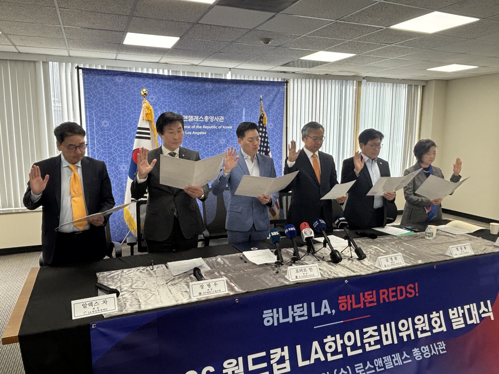 LA한인회와LA한인상공회의소, 한인축제재단, 민주평통 LA협의회, 재미대한 LA체육회 등 주요 한인단체들과 LA총영사관이 함께하는 2026북중미 월드컵 합동 응원전 준비위원회가 발대식을 갖고 본격 준비에 돌입했습니다.