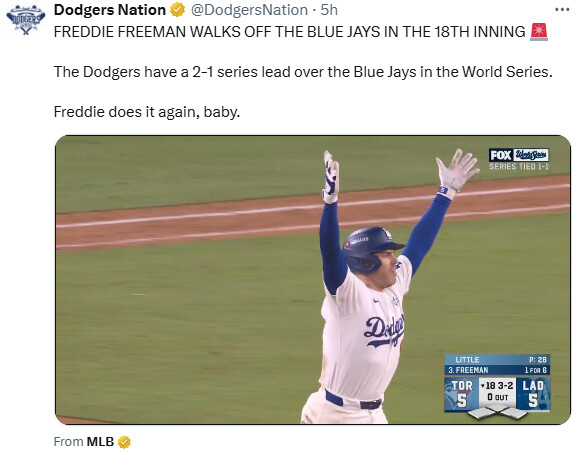 LA다저스가 토론토 블루제이스와의 월드시리즈 3차전에서 18이닝 혈투 끝에 6대 5로 승리했다. 다저스는 1차전을 내준 뒤 2차전과 3차전을 연달아 잡으며 시리즈 전적 2승 1패로 앞서갔다. 어제(27일) 3차전 경기 시간은 6시간 39분으로 사실상 더블헤더에 가까운 장기전이었다…